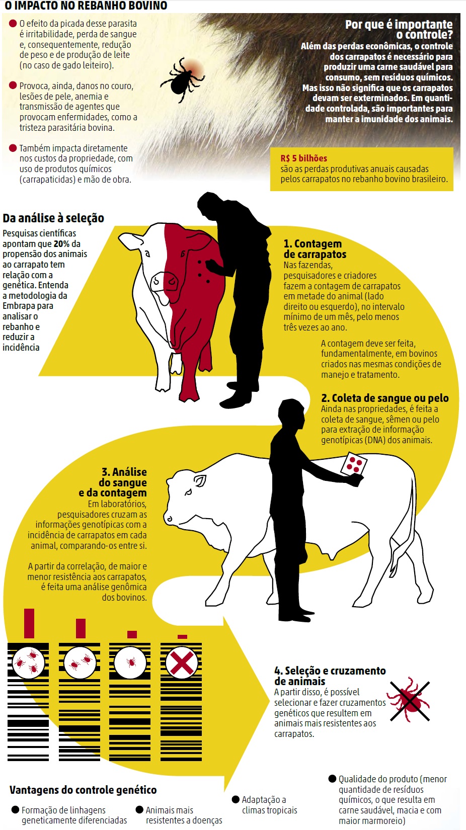 A necessidade do controle é justificada pelos prejuízos que causam à pecuária brasileira: mais de US$ 2 bilhões anuais (em torno de R$ 5 bilhões). A identificação de animais menos e mais propensos à infestação é feita pela chamada análise genômica, cruzamento entre a contagem de carrapatos no animal e as informações genéticas.